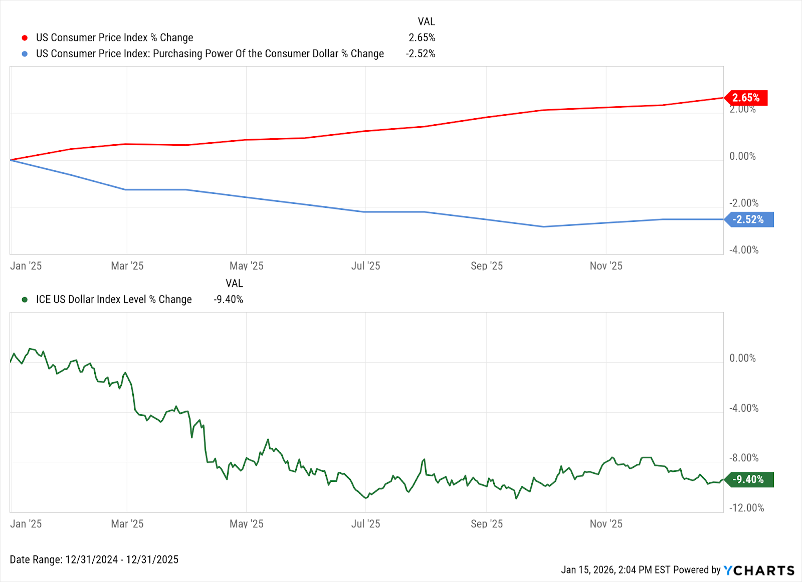 - Foreign stocks and bonds made a strong comeback in 2025, supported by a weaker US dollar and improving relative earnings trends in international markets. We have favored these stocks in client portfolios throughout the past year and continue to recommend a global balance of assets.